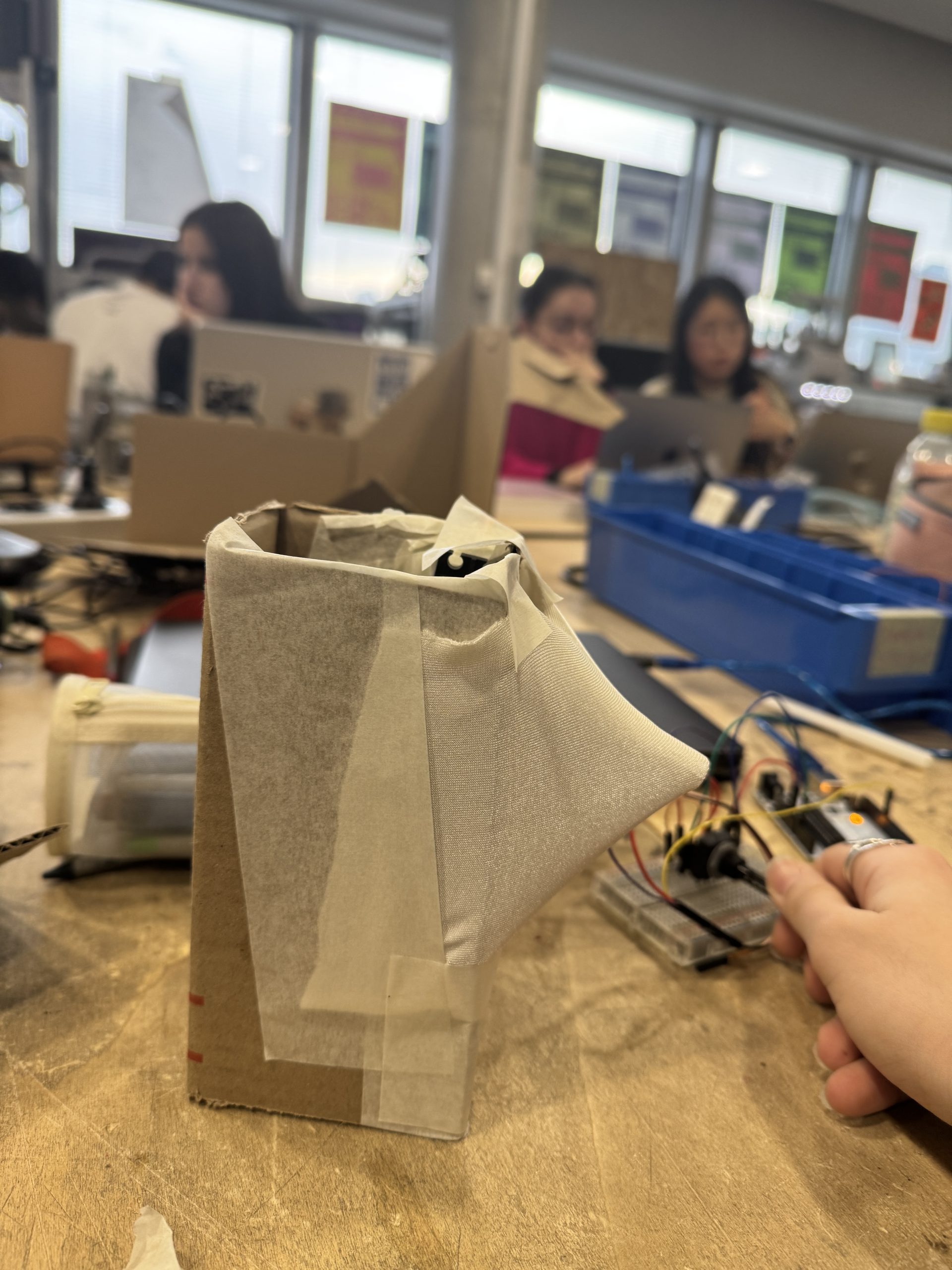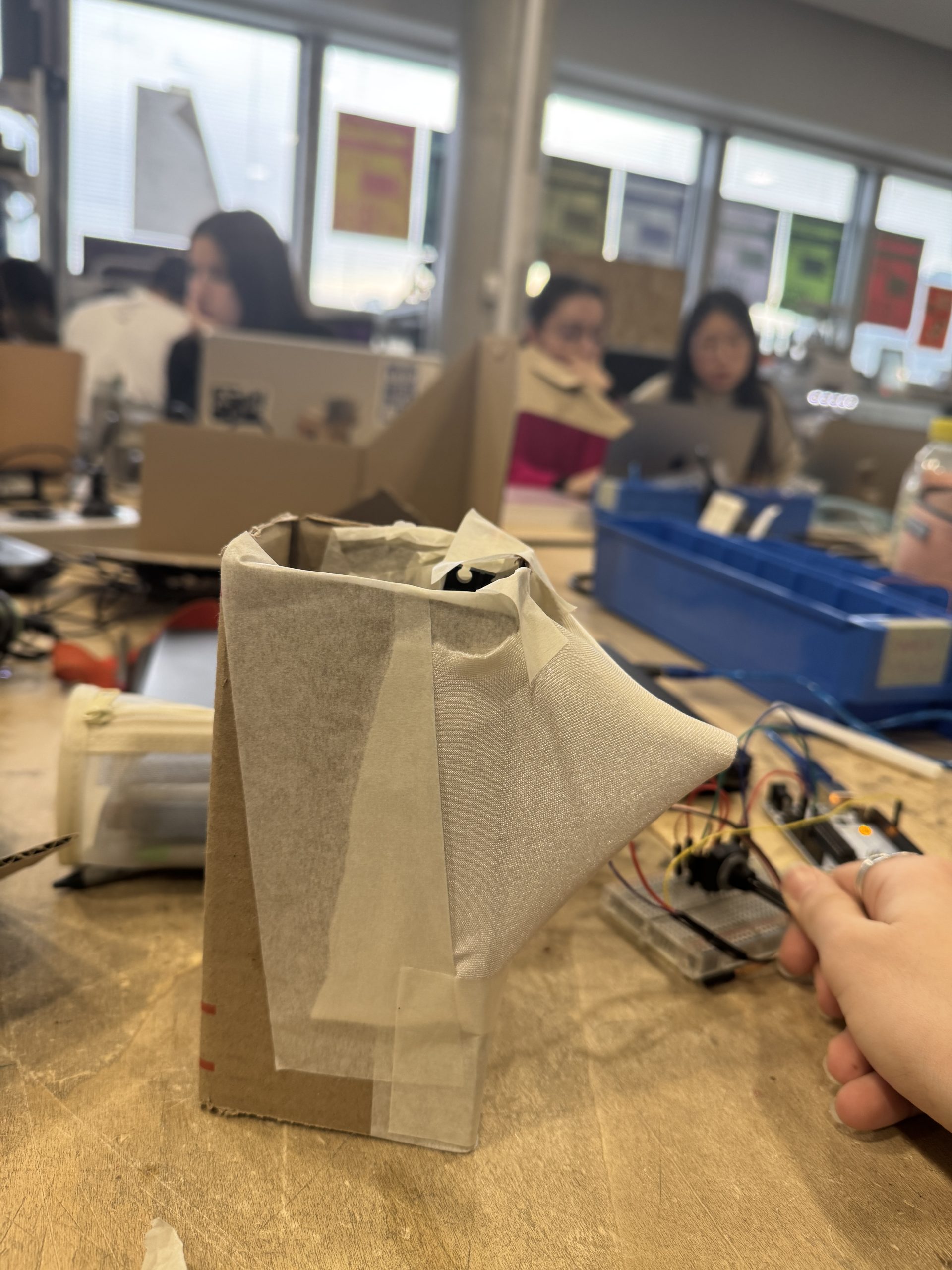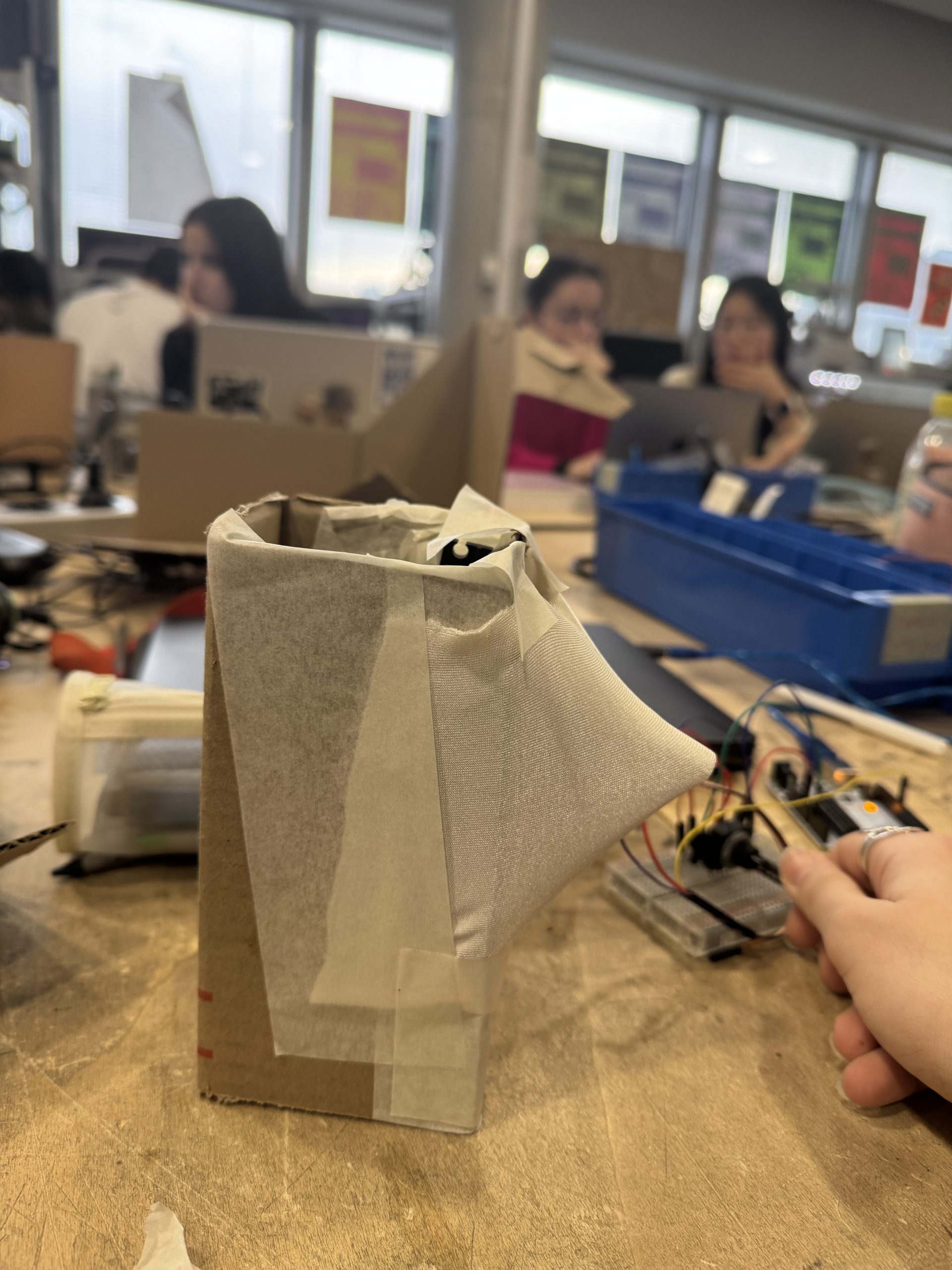 Utilisation de plusieurs servo-moteurs qui mettent en mouvement plusieurs battons. Les battons viennent strech le tissus Lycra qui couvrent toute la structure.