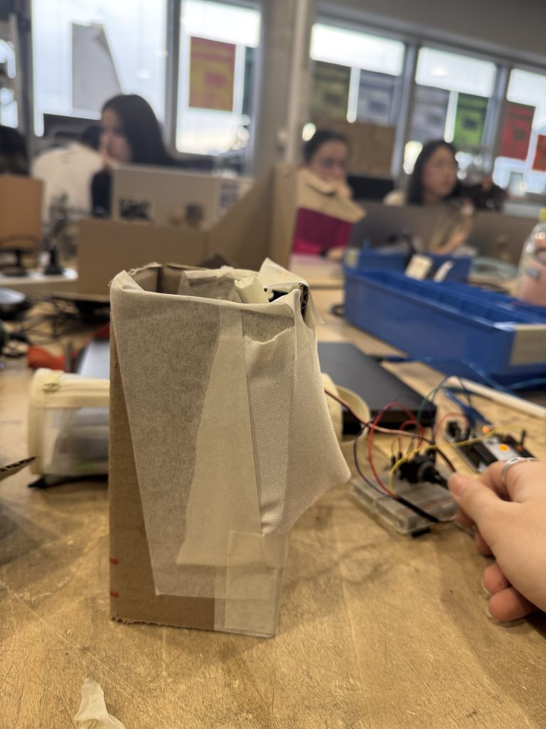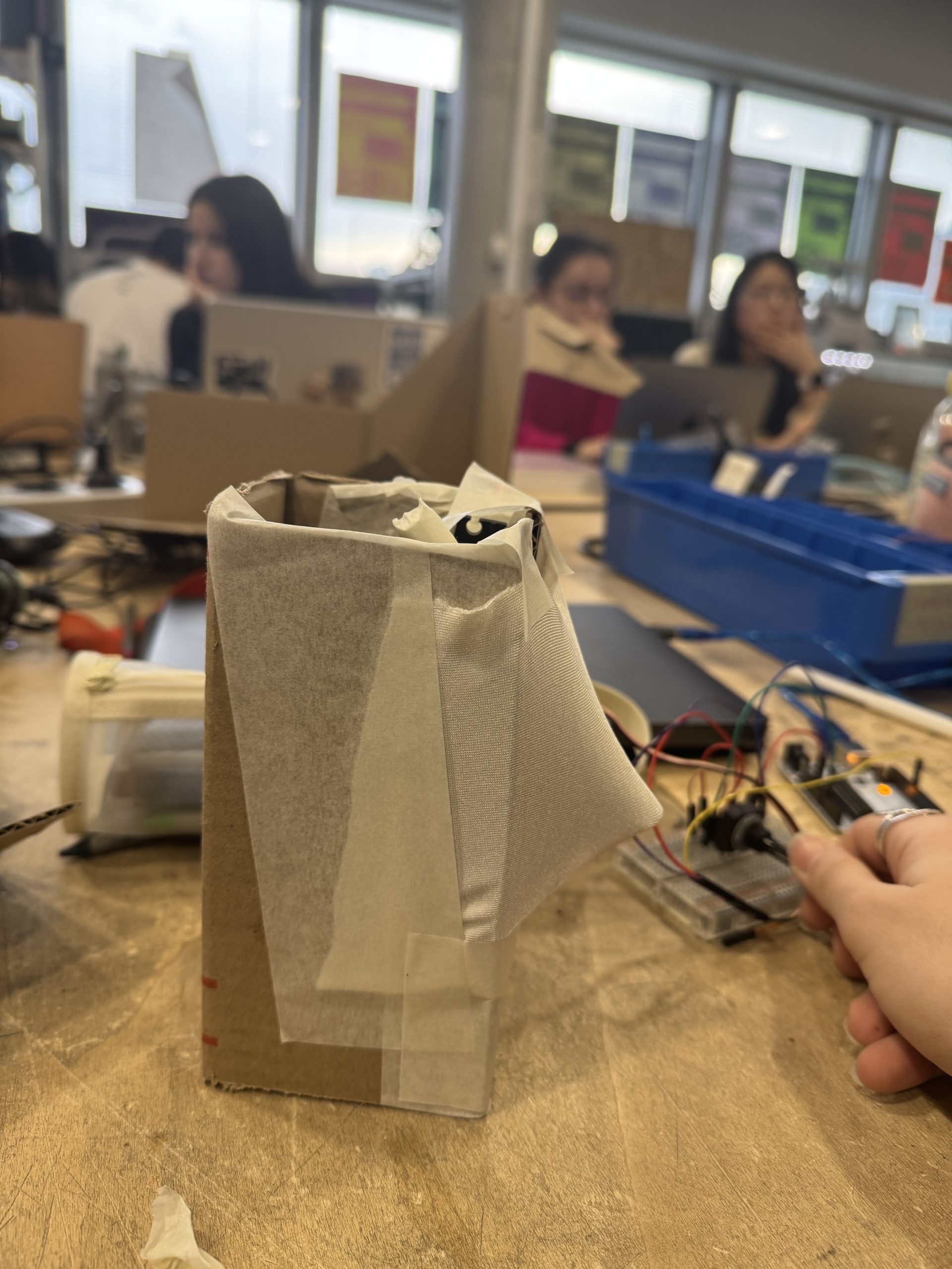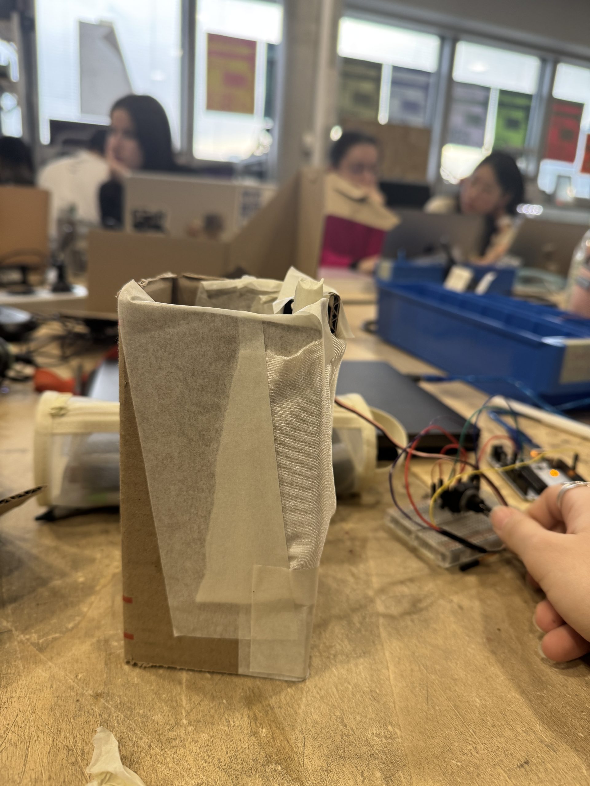 Utilisation de plusieurs servo-moteurs qui mettent en mouvement plusieurs battons. Les battons viennent strech le tissus Lycra qui couvrent toute la structure.