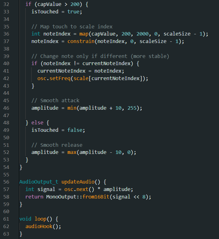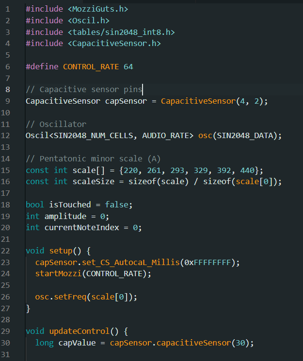 Le code qu’on à utilisé pour le moment marche bien pour reproduire un son avec le contact, et tient en compte la pression appliquée, mais nous n’avons pas réussi à y insérer un audio Mozzi de notre choix. Le capteur capacitif est aussi extrêmement sensible et peu réagir que en s’y approchant.