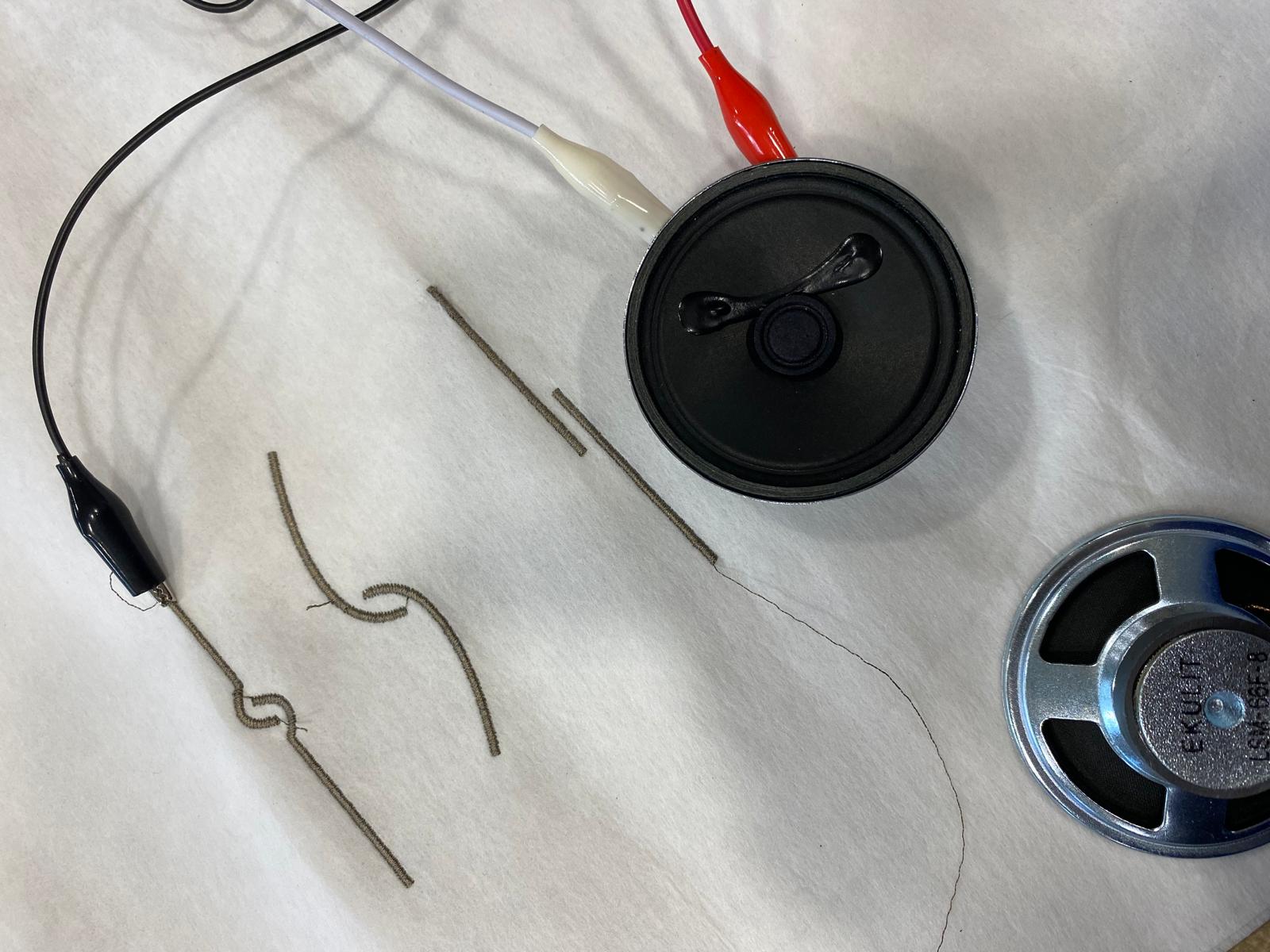 Objet recouvert de membranes en textile brodé avec du fil métallique, qui avec le contact, émet du son a a travers de capteurs capacitifs.