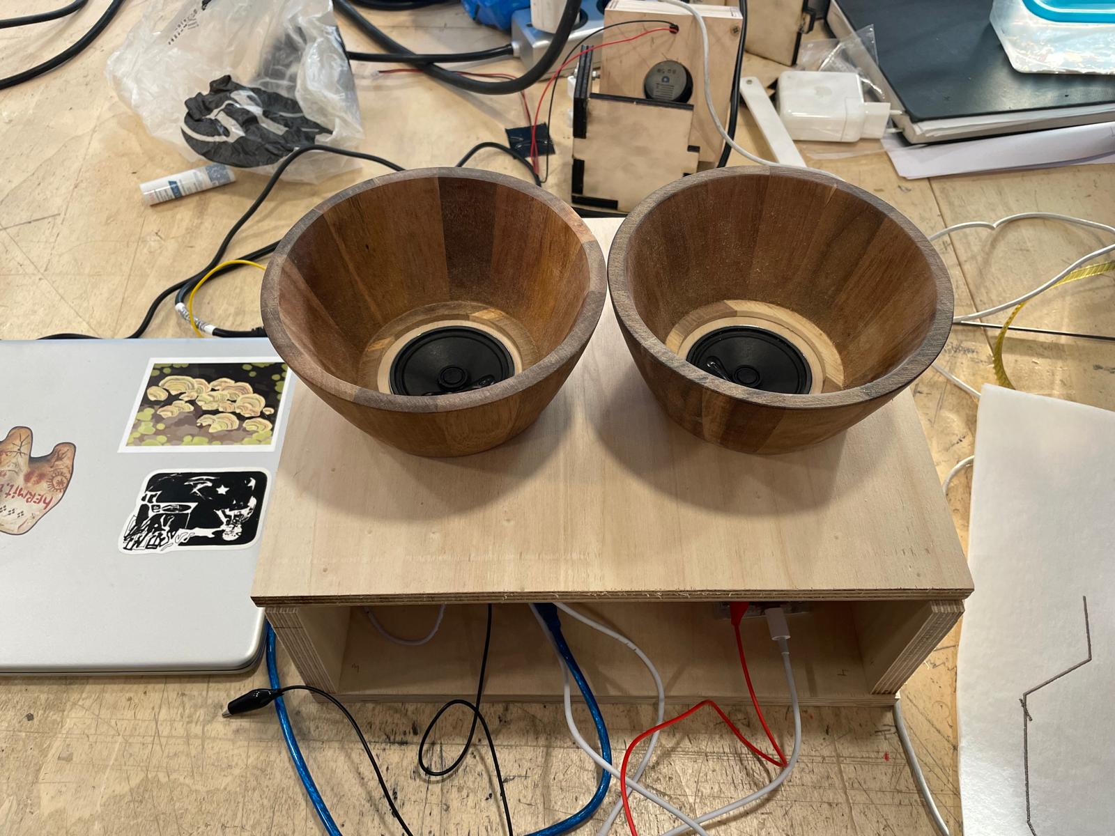 Matériaux pour la structure – Fil conducteur de cuivre et tissus pour recouvrir le tout. Structure en cône pour amplifier le son et boîte pour cacher les cables (optionnel).