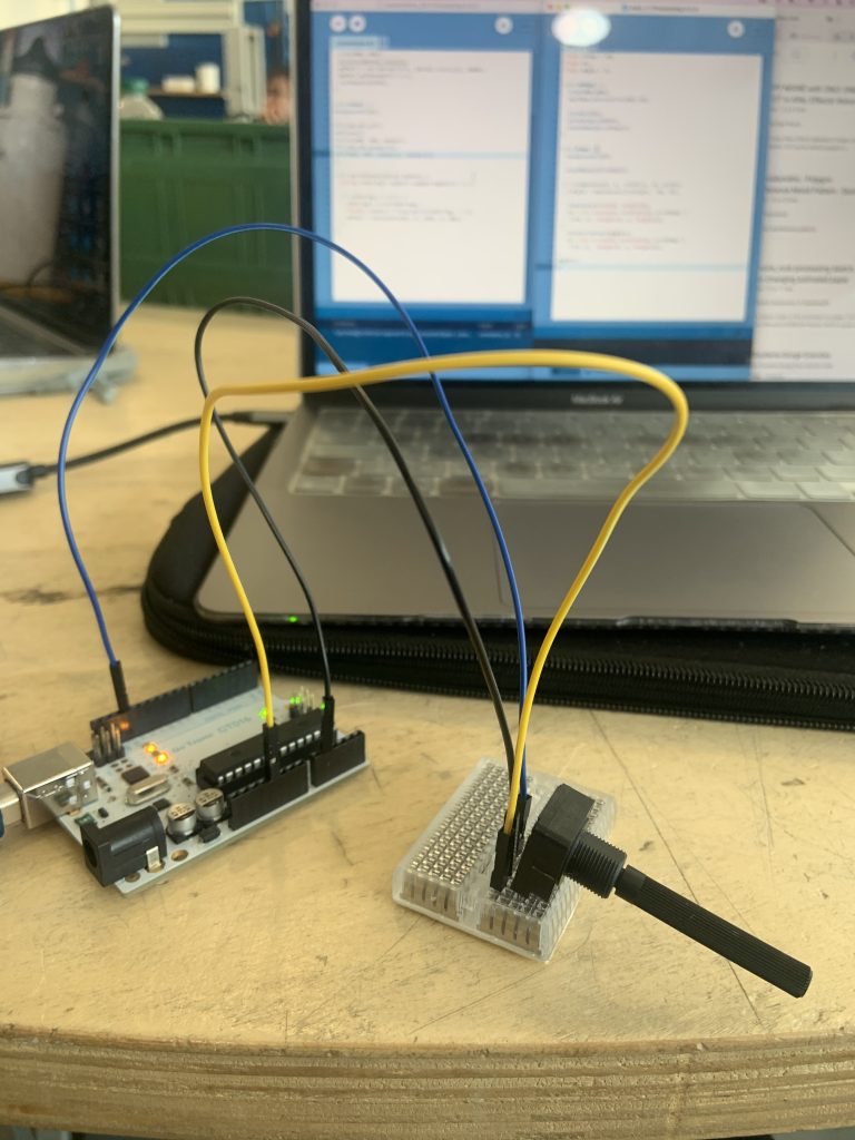 Les premiers tests ont été fait avec un potentiomètre, avant de le remplacer par le textile, qui va donc devenir l’antenne.